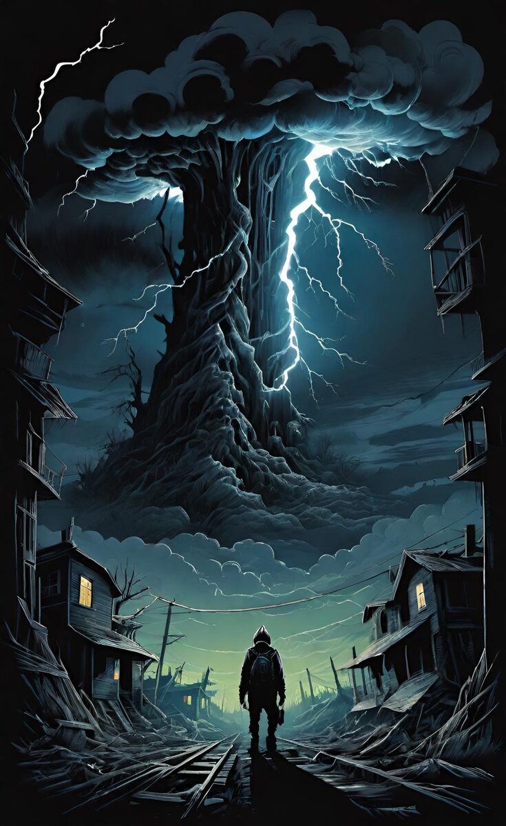 На следующее утро из тьмы показался продолговатый тёмный силуэт башни, уходящей ввысь. Маяк, верхушка с давно погасшим фонарём которого почти полностью скрывалась метелью. Под самой верхушкой силуэт был разделён надвое, и по мере приближения к маяку можно было заметить, что в этом месте маяк был разрушен какой-то неведомой силой, но при этом верхушка продолжала быть стабильно недвижимой, будто бы поддерживаемая каким-то образом уцелевшей железной винтовой лестницей с прутьями-перилами. Кроме этой тонкой лестницы, ничего больше не соединяло основание маяка с верхушкой. Разрушенные металлические опоры торчали во все стороны, как поломанные кости.