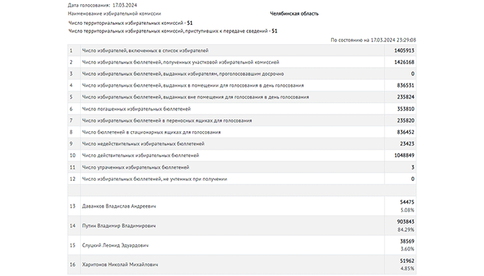 Владимир Путин лидирует на выборах президента РФ с 87,35% голосов после обработки 96,45% протоколов, передает корреспондент Агентства новостей «Доступ». Николай Харитонов (КПРФ) набирает 4,29% голосов, Владислав Даванков («Новые люди») – 3,82%, Леонид Слуцкий (ЛДПР) – 3,16%. В целом по стране явка составила 74,22%. Что касается непосредственно Челябинской области, то действующий глава государства набрал 84,29% голосов после обработки 1 498 протоколов. На втором месте Даванков (5%), третьем – Харитонов (4,9%), четвертом – Слуцкий (3,6%). Участие в выборах приняли 75,8% избирателей, сообщили в региональной избирательной комиссии.