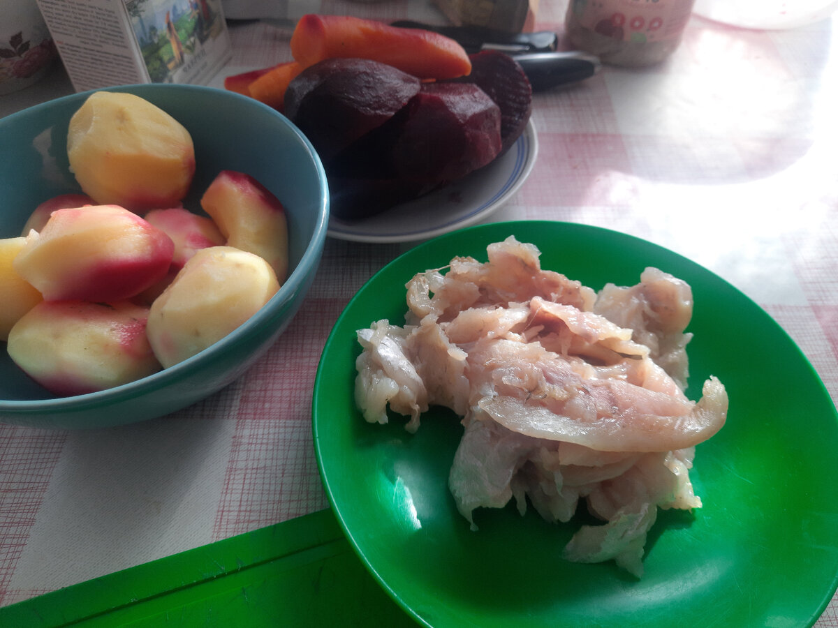 Начинается этот салат издалека: с прошлого лета - столько у меня лежит окунь в морозилке, прежде чем попасть на засол весной в пост. Засолку я делаю слабую - малосольную - чтоб не перебить вкус настоящей рыбы. Но пряностей в маринад кладу много - рыба получается ароматная. Готового окуня, после недельного посола в прохладном месте, разделываю на филе. И раскладываю по поллитровым банкам, убираю в холодильник. В дальнейшем использую филе малосольного окуня для бутербродов и для приготовления салатов. Один из лучших салатов - "сельдь под шубой", точнее - ОКУНЬ под шубой. Ингредиенты традиционные: картошка отварная, морковь, свекла и окунь, разумеется. Филе окуня режется на маленькие кусочки и укладывается нижним слоем. Накрывается следующим слоем - картошкой. Картошку желательно посыпать кориандром и укропчиком, получится очень пикантно. Далее морковка и свекла. Под свеклу прекрасно ложится немного рубленного чеснока. Сбрызгивается натуральным подсолнечным маслом и виноградным уксусом. В