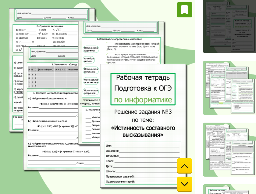 Рабочая тетрадь с обложкой подготовка к решению заданий номер 3 в ОГЭ ГИА по информатике, по теме: «Истинность составного высказывания». 6 заданий + ответы и рефлексия. 5,6,7,8,9,10,11 класс. Подготовка к экзаменам. Подойдёт и для урока во время изучении темы «Истинность составного высказывания».