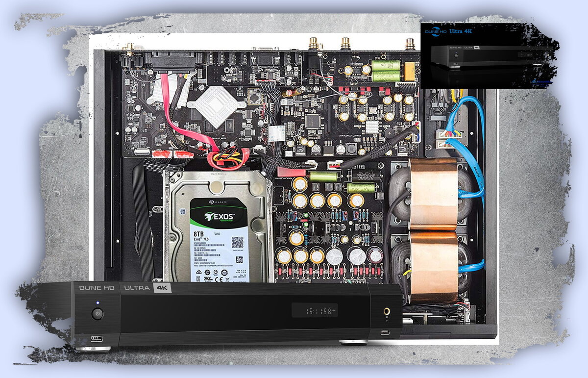 Большинство из них (особенно из топового сегмента) не стыдно выпускать и в полностью прозрачных корпусах. Начиная от топовых сетевых и медиаплееров/ стримеров (в качестве примера на заглавной иллюстрации можно наблюдать внутренности медиаплеера DUNE HD Ultra 4K) и заканчивая классическими усилителями. К примеру таким: