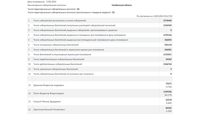 Действующий президент Владимир Путин в Челябинской области набирает 84,4% голосов, передает корреспондент Агентства новостей «Доступ». По информации региональной избирательной комиссии, обработано 2146 протоколов, явка составила 78,7%. За самовыдвиженца Владимира Путина проголосовали 84,42% южноуральцев, на втором месте представитель КПРФ Николай Харитонов – 5,13%, далее идет кандидат партии «Новые люди» Владислав Даванков – 5,01%, Леонид Слуцкий от ЛДПР взял 3,54% голосов. Это данные на 8 утра 18 марта. Что касается абсолютных цифр, то за Путина подано 1 млн 349,3 тыс. бюллетеней, Харитонова – 86,3 тыс., Даванкова – 76,6 тыс., Слуцкого – 55,4 тыс. бюллетеней.