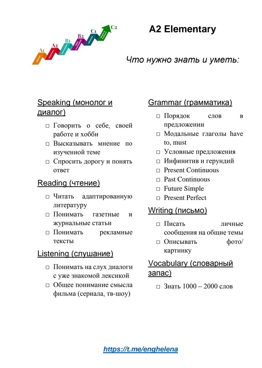 Можно ли построить маршрут на карте до точки B, не зная свое местоположение? Так и в изучении языка. Проверьте, знаете и умеете ли вы то, что требуется для уровня A2 с помощью чек-листа, который я для вас приготовила 🙂 Источник