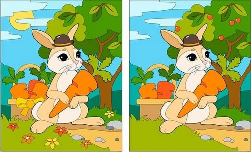 Некоторые исследования сообщают, что игры такого типа улучшают «исполнительные функции, рабочую память и скорость обработки данных» у молодых людей, а другие рекламируют преимущества головоломок для защиты когнитивного здоровья пожилых людей. Найди 5 отличий! На двух изображениях изображен кролик, держащий морковку. Хотя на первый взгляд изображения кажутся идентичными, но между ними есть 5 различий, и есть только 20 секунд, чтобы их найти. Некоторые различия легко заметны, тогда как другие бывает трудно обнаружить и могут потребовать внимательного взгляда. Мышка по имени Лика В лесу жила маленькая мышка по имени Лика. Она была любознательным созданием. Однажды Лика нашла волшебный сад с грибами разных цветов. Вокруг было так много красок и магии, что мышка заблудилась в этом волшебном месте. Но благодаря твоей помощи, она быстро найдется. Правда ведь? Математическая головоломка Да, математическая головоломка хорошо подходит для развития умственных способностей, так как решение таких