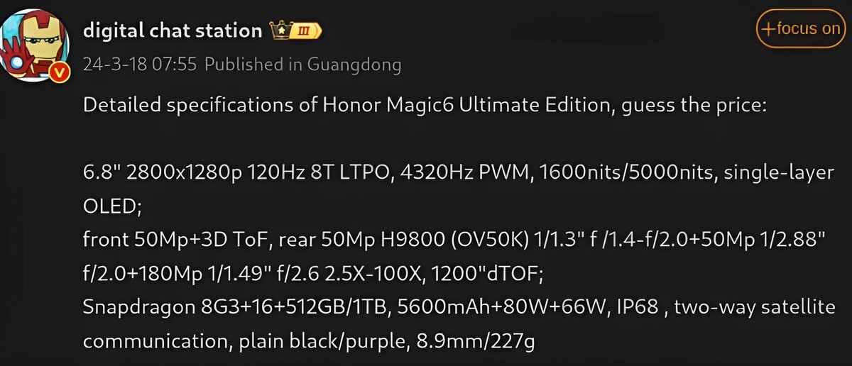 Сегодня китайская компания Honor выпустит свой новый смартфон Magic 6 Ultimate. Перед официальным релизом характеристики устройства были размещены в интернете известным инсайдером Digital Chat Station. По слухам, Honor Magic 6 Ultimate будет оснащен большим 6,8-дюймовым 8T LTPO OLED-дисплеем с разрешением 2800 x 1280 пикселей. Дисплей будет обладать частотой обновления 120 Гц и постоянной яркостью 4320 Гц для сокращения нагрузки на глаза. Также DCS предполагает, что у телефона будет впечатляющий пиковый уровень яркости, достигающий потенциально 1600 нит при обычном использовании и до 5000 нит для HDR-контента. Что касается передней камеры, подразумевается наличие 50-мегапиксельного сенсора в сочетании с датчиком 3D ToF для селфи. Конфигурация задней камеры будет включать основной 50-мегапиксельный датчик (OmniVision OV50K) с большим размером сенсора 1/1,3 дюйма и переменным диапазоном диафрагмы (f/1,4-f/2,0). Его будет сопровождать дополнительный 50-мегапиксельный сенсор и мощный 180-м