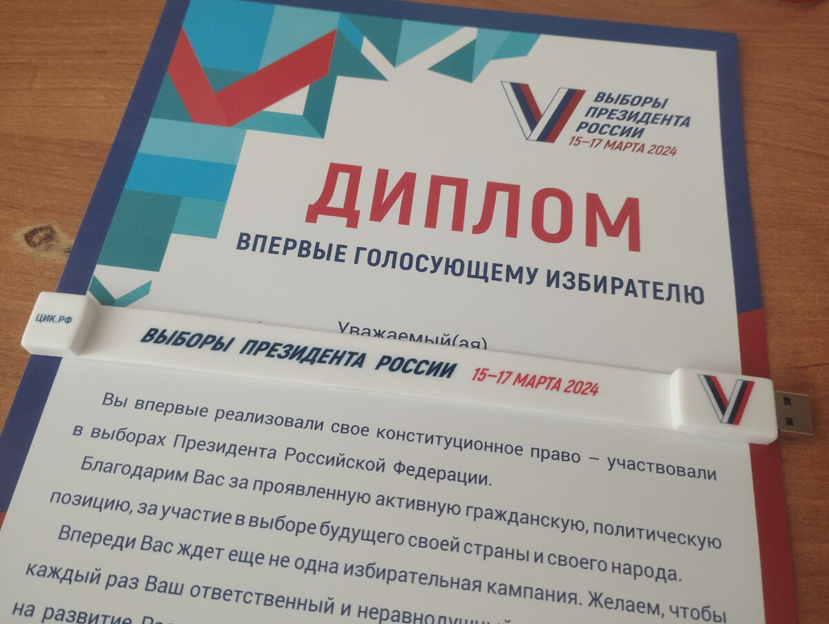 Всем привет! Сегодня мне хотелось бы рассказать о том, как я впервые пошëл голосовать. 16 марта, сразу после занятий, я отправился на мой избирательный участок. Когда-то давным давно, когда был ещё маленьким, мне приходилось посещать это место, но тогда я был с родственниками, а сейчас - один. Мне удалось достаточно быстро там освоиться. И вот я уже в кабинке делаю выбор, через пару секунд я уже у урны. Ура! Проголосовал! Я уже хотел уходить, но тут меня задерживают и приятно удивляют, вручая диплом и флешку в виде браслета. Итог таков - мой первый поход на выборы прошëл крайне удачно и даже оказался с приятными сюрпризами. Думаю и впредь ходить на выборы президента.