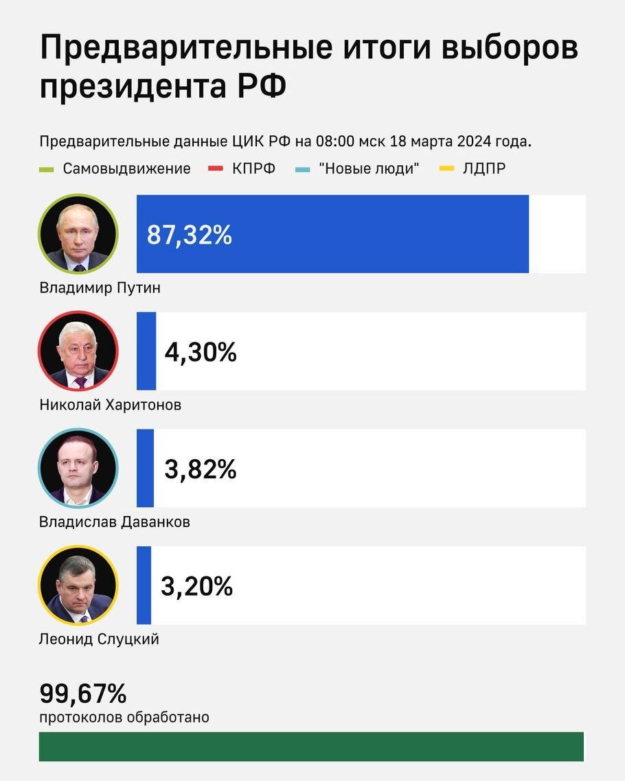 С 15 по 17 марта проходили выборы президента России. К данной минуте обработано 99,43% бюллетеней. Известны предварительные итоги голосования. Явную победу одержал действующий глава государства. Путин – 87,32% Харитонов (Ком. партия) – 4,3% Даванков (Новые люди) – 3,82 Слуцкий (ЛДПР) – 3,2%. Обработка официально не завершена, но уже известно, что Путину присылают письма с поздравлением. Ставить лайк, если информация была полезна и интересна. Рекомендую: Наш телеграм: https://t.me/bmagnit Вконтакте: https://vk.com/public222989766