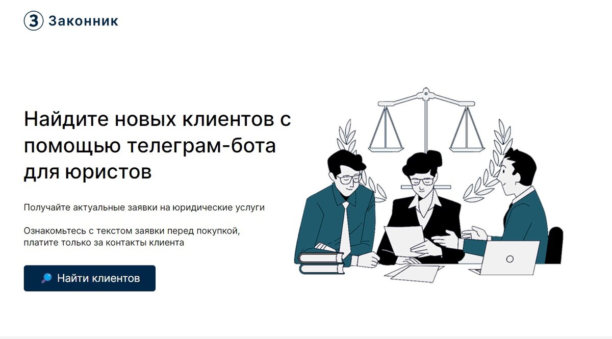 Сервис Законник - это инновационный инструмент с использованием телеграм-бота, который помогает юристам и адвокатам находить клиентов и партнеров в различных регионах для совместной работы над задачами клиентов. Он упрощает процесс поиска и привлечения новых клиентов, обеспечивая более эффективное взаимодействие между специалистами и потенциальными заказчиками. Забудьте о трате бюджета на маркетологов. Теперь вы можете приобрести контакт потенциального клиента всего за 90 рублей и сразу приступить к работе. По отзывам постоянных пользователей оптимальное количество лидов для покупки составляет 10 штук. Как это работает? С помощью Законника вы можете легко находить новых клиентов всего в несколько кликов. Получайте заявки от десятков клиентов, нуждающихся в правовой помощи, прямо в телеграм-канале. После этого вы покупаете контакт клиента от 90 рублей и договариваетесь о проведении консультации по телефону. На этой консультации вы выявляете потребности клиента и предлагаете сотруднич