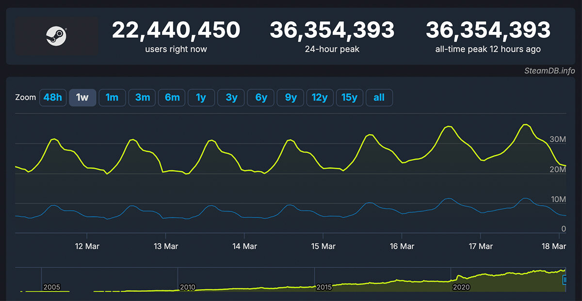 Steam снова побил свой собственный рекорд одновременного онлайна. В очередной раз за этот месяц. Всего две недели назад была зафиксирована рекордная цифра в 34 649 583 пользователей, в воскресенье вечером Steam превзошел себя, добравшись до 36,3 миллионов человек. Согласно данным SteamDB — 11,5 миллионов из них активно находились в сети и играли в момент установки рекорда, а остальные примерно 25 млн были в системе и/или бездействовали в то время. Количество одновременных пользователей в Steam начало активно расти примерно в то время, когда мир начал вводить локдауны в начале пандемии COVID-19 в 2020 году, но даже сейчас, похоже, миллионы из людей предпочитают не ходить куда-то в воскресенье, а сесть перед компьютером на пару сеансов в нынешнего фаворита — или попробовать что-то новое. Еще более интересно то, что хотя подобные рекорды часто устанавливаются, когда новая игра вызывает ажиотаж, в эти выходные активность может быть связана с весенней распродажей. Counter-Strike 2 по-прежне