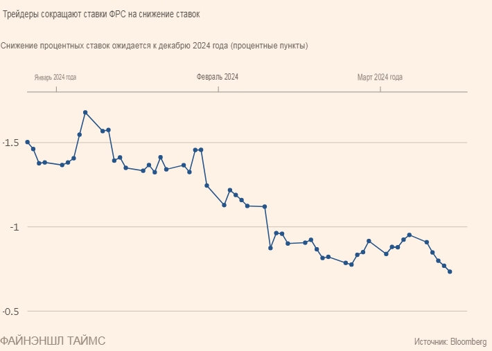 Трейдеры делают ставку на три сокращения на четверть пункта в 2024 году, тогда как в начале года ожидалось сокращение на шесть или семь пунктов. Инвесторы наконец-то согласились с Федеральной резервной системы в том, что она снизит процентные ставки всего три раза в этом году, положив конец многомесячному противостоянию между рынками и центральным банком. Согласно данным, собранным LSEG, после ряда экономических данных, сигнализирующих о том, что инфляция в США остается стабильно высокой, трейдеры в пятницу прогнозировали снижение ставок всего на три четверти пункта к концу года. До неожиданного роста инфляции в США во вторник инвесторы делали ставку на сокращение почти на полный процентный пункт к декабрю. В январе они предполагали снижение ставок на шесть-семь четвертей процента к концу 2024 года. «Рынок был поставлен на колени», — сказал Падраик Гарви, руководитель исследовательского отдела Северной и Южной Америки в ING, утверждая, что сохранение инфляции вынудило инвесторов отступ