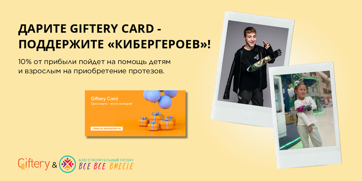 Мы в Giftery не перестаем поддерживать Благотворительные фонды. Ведь мы считаем, что важно помогать не только своим близким, но и тем, кто нуждается в поддержке со стороны общества. Поэтому мы продолжаем нашу добрую акцию в поддержку подопечных Благотворительного фонда «Все Все Вместе». С 2018 года фонд «Все Все Вместе» оказывает поддержку детям и взрослым с травмами и заболеваниями опорно-двигательного аппарата, чтобы люди могли жить полноценной жизнью. Они создают экосистему, в которой нет слова «инвалид», а есть слово - «Кибергерой»! Как помочь?