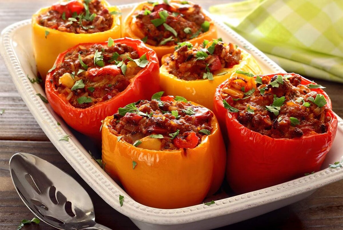 От этого блюда в восторге вся моя семья. Стабильно просят приготовить его как минимум один раз в пару недель. Поэтому сегодня я решила рассказать вам, как приготовить фаршированные перцы в духовке. Рецепт простой и быстрый. Главный секрет этого блюда в свежих ингредиентах. В этом вопросе меня всегда выручает Мытищинская ярмарка. За фермерским мясом я сразу бегу к добрейшему дяде Армену, прошу либо сразу там сделать фарш, либо делаю его дома самостоятельно. И недалеко от него, там же на Мытищинском рынке, покупаю свежайшие овощи. Это достаточно простой рецепт фаршированных перцев с рисом, который не займет у вас много времени. Для начала нам понадобятся: Рецепт фаршированных перцев: Шаг 1: Приготовим начинку. Рис тщательно промываем и варим до готовности, после чего спокойно оставляем остужаться. Лук и морковь мелко нарезаем и обжариваем на сковороде до мягкости. Добавим фарш и жарим до готовности, приправляя солью, перцем и любимыми специями. Шаг 2: Подготовим перцы. Отрежем верхушки и