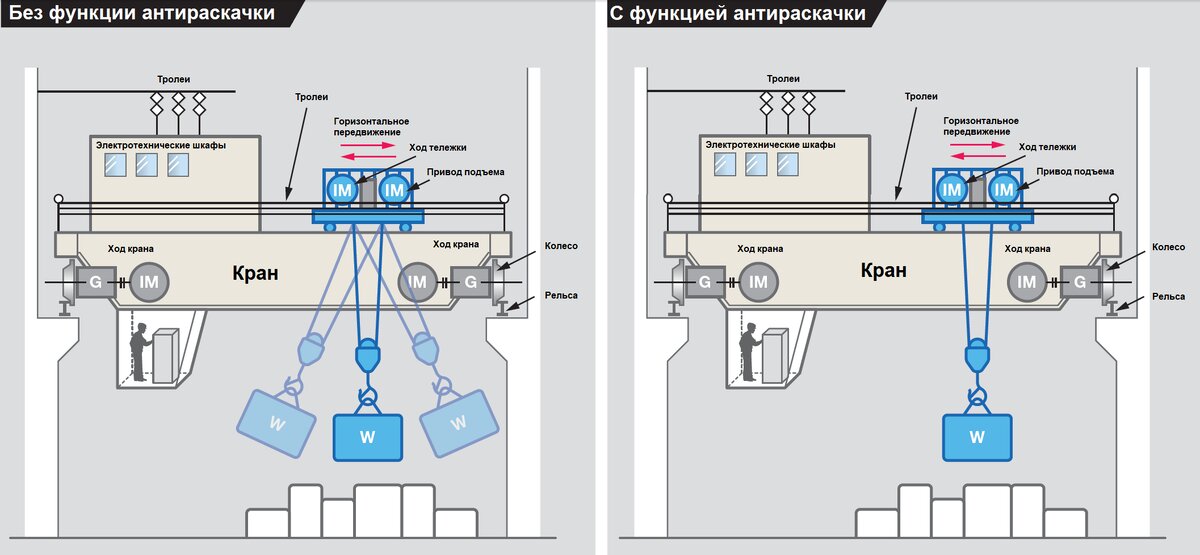 Благодаря использованию оригинальной технологии контроля раскачивания Mitsubishi Electric, раскачивание объекта, при передвижении крана предотвращается. Раскачивание подавляется в момент остановки, оператору не нужно предпринимать никаких дополнительных действий. Такое управление сокращает время перемещения грузов и способствует эффективной работе.