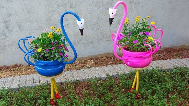 Удивительная идея, которая вызовет восхищение! Стильная переделка обыкновенных материалов, таких как пластиковая бутыль и шланг, в нечто потрясающее и бесподобно красиво. Декор станет диковинкой вашего участка! Только взгляните на увлекательный процесс работы и поразительный результат чуть ниже. Что понадобится: Переделка бутыли Подготовьте большую бутыль 19 л (для кулера и т. п.). Визуально разделите её на 3 части. Отпилите нижнюю с дном. Паяльником или горячим гвоздём сделайте отверстие в пластике. В шланг вставьте 4 толстых проволоки. Проденьте. Сделайте ещё пару маленьких отверстий рядом. Закрепите проволоку хомутами (кабельными стяжками), лишнее обрежьте. Из шланга с проволокой внутри сформируйте длинную шею и голову. Материал податливый, а значит, с ним несложно работать. Сбоку от шеи слева и справа, а также напротив сделайте по 3 отверстия. Также вставьте шланг, но уже с 1 проволокой внутри. Зафиксируйте хомутами. Сформируйте крылья. Основание — ножки Возьмите 2 трубы ПВХ. Отмет