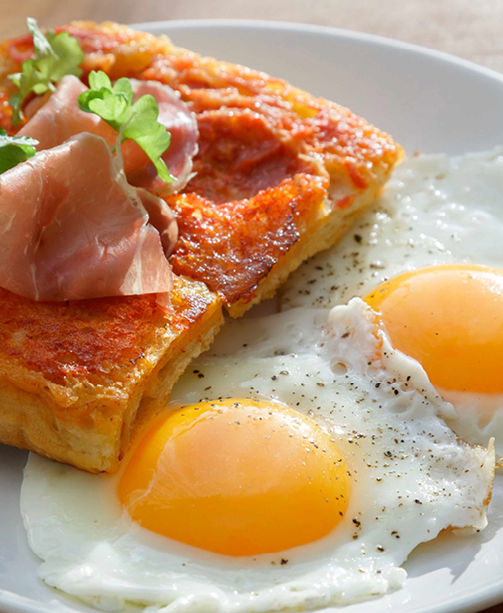 4. Хлеб получится хрустящим снизу и мягким сверху. Ломтик хамона или бекона заставят блюдо заиграть новыми красками.