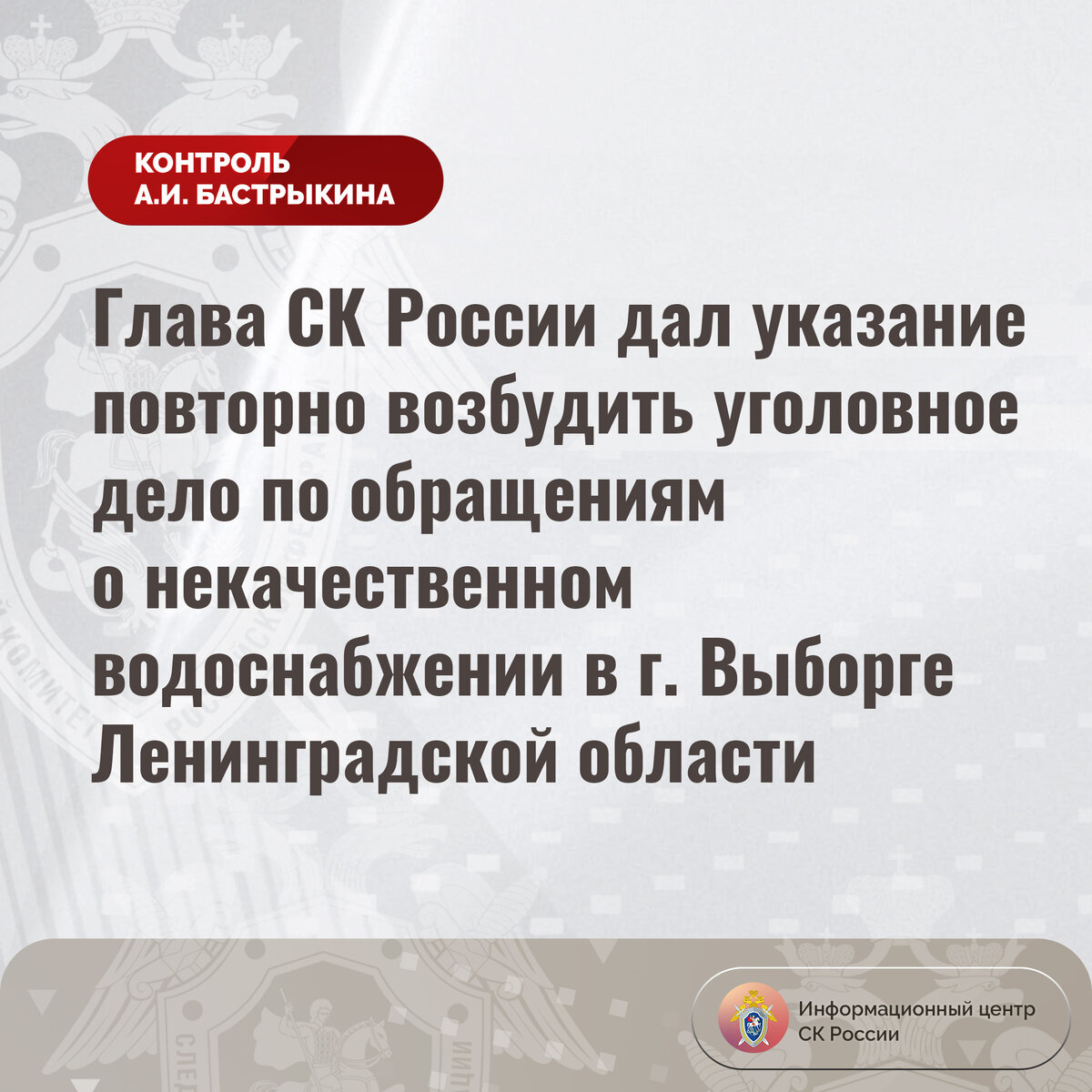 Глава СК России дал указание повторно возбудить уголовное дело по обращениям о некачественном водоснабжении в г. Выборге Ленинградской области