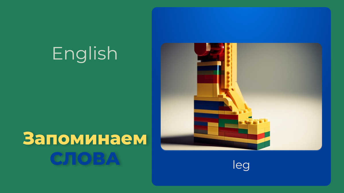 📌Не получается представить образ? Попытайтесь ещё минуты две на одно слово. Если всё равно не выходит, оставьте это слово, переходите к следующему. Со временем, с тренировками образы будут «всплывать». Не на этих словах, так на других. Запоминание слов. Нога — leg [lɛg] — лего. Представьте, что нога полностью сделана из фантастического детского конструктора лего. Колено — knee [niː] — нитки. Представляем: на колено вместо тейпов или бинтов намотаны красные и черные нити. Ступня — foot [fʊt] — футляр. Непонятно откуда появился динозавр и