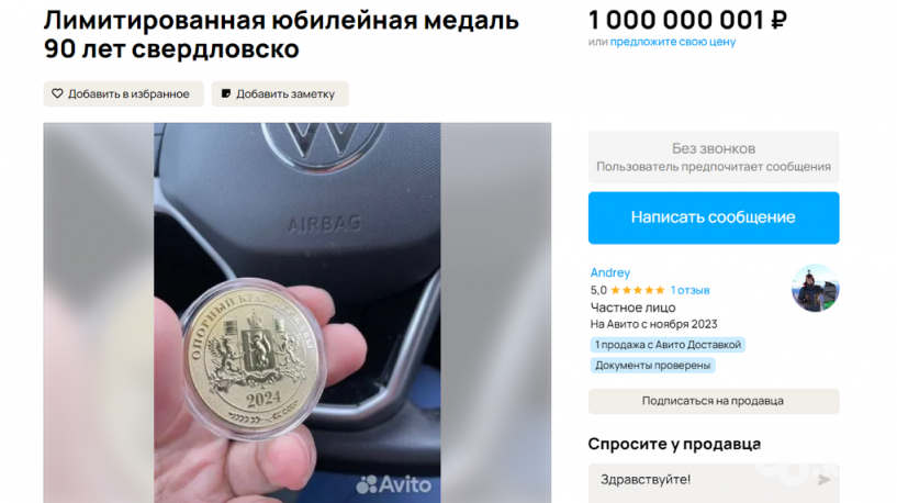 Каждому участнику викторины «Опорный край», которая совпала с проведением президентских выборов, организаторы вручили памятную медаль «90 лет Свердловской области». В первый же день владельцы презентов начали распродавать медали через интернет-площадки. На «Авито» бесплатный презент продают за сотни тысяч и даже миллионов рублей. Только в одном объявлении нам встретилась пометка «забронировано». Собрали для вас самые абсурдные, смешные и нелепые комментарии продавцов. С цитатами Рамзана Кадырова, объявлениями о продаже квартиры, обещаниями скидок и просьбами дать денег на платеж по ипотеке. Медаль за 1 000 000 001 рубль «Вашему вниманию предлагается самая редкая медаль в мире. Первая коллекционная монета в честь 90-летия Свердловской области. Кто понимает, тот понимает. Кто не понимает, тот не поймет». Медаль за 7 150 000 рублей «Волшебная монета. Купив эту монету Вы не только сделаете доброе дело, почистите карму, но и осуществите мечту одного человека. Это девушка, которая мечтает о