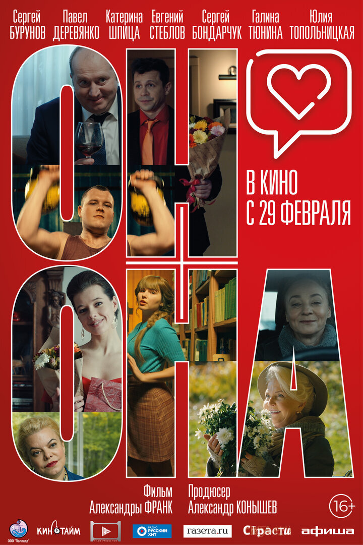 Он+Она - фильм режиссера Александры Франк. 5 новел, таких разных, но объединенных общей атмосферой и исследованием главного вопроса в жизни: «Что же такое любовь?» В главных ролях: Сергей Бурунов, Катерина Шпица, Павел Деревянко, Юлия Топольницкая, Анатолий Руденко, Сергей Бондарчук и другие. Жанр картины ближе к докуреалити, где художественный вымысел переплетается с кадрами документального проекта «Кинотест». Где актеры делились своими переживаниями о любви, разводе, детях и многом другом. В нем приняли участие: Константин Крюков, Даша Чаруша, Иван Янковский, Агния Дитковските, Егор Корешков, Нино Нинидзе и другие. Драматические связки переходят в комедийные моменты и обратно, динамика происходящего у каждой новеллы своя. Первая новелла о кризисе в отношениях молодой пары. В главных ролях здесь Павел Деревянко и Екатерина Шпица. Это невероятно гармоничный дуэт. Четко подмечено одиночество внутри героев. Мы вместе, но не понимаем друг друга. Каждый в своем мире, со своей картиной ре