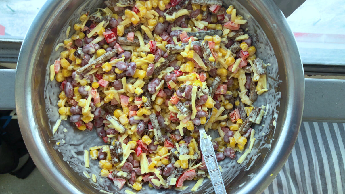Салат с Красной фасолью Вкусный салат чтобы просто и быстро покушать! Когда дома нахожу банку консервированной фасоли(или просто купил), готовлю этот салат. Простой и быстрый салат из простых продуктов. Быстрый и вкусный салат за минуты на ужин. Простой салат готовится на скорую руку. Салат с фасолью получается сытным. Несмотря на доступность всех ингредиентов и простоту приготовления, получается салат очень вкусный и красивый ! "Записка в магазин:..." Фасоль консервированная в собственном соку - 1 банка; Кукуруза - 1 банка; Сыр - 100-150 грамм; Чеснок - 1 зубок; Болгарский перец -1 штука маленькая; Ржаные сухарики - 30-40 грамм; Майонез - по вкусу; Соль по необходимости и по вкусу; Пошаговое описание рецепты: Шаг 1: Болгарский перец нарезать на маленькие кубики. Сыр натереть на крупно терке. Чеснок измельчить любым способом; Шаг 2: В чашке собрать все ингредиенты: нарезанный кубиком перец, сыр, чеснок, фасоль, кукурузу, сухарики. Добавить майонез по вкусу. Хорошо перемешать. Е