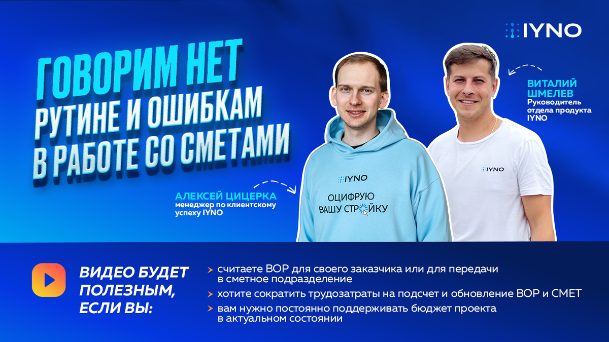 Быстро и удобно в IYNO Виталий Шмелев, руководитель отдела продукта, и Алексей Цицерка, менеджер по клиентскому успеху, в новом видео на практических примерах показывают, как цифровой подход в стройке помогает сметчикам, инженерам ПТО, СДО и руководителям строительных проектов: Это видео будет полезным, если вы: Посмотрите видео, если у вас масса изменений в процессе строительства и надо быстро и без лишних трудозатрат понимать, как они влияют на стоимость. Да, у меня именно так. Иду смотреть!
