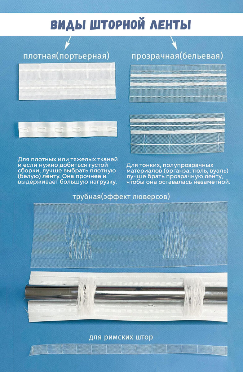 Шторная лента – это специальная лента, которая используется для создания складок и пришивается к полотну по верхней части или в том месте, где планируется собрать ткань в сборки. ↕️ По ширине она бывает от 1,5 см до 25 см: