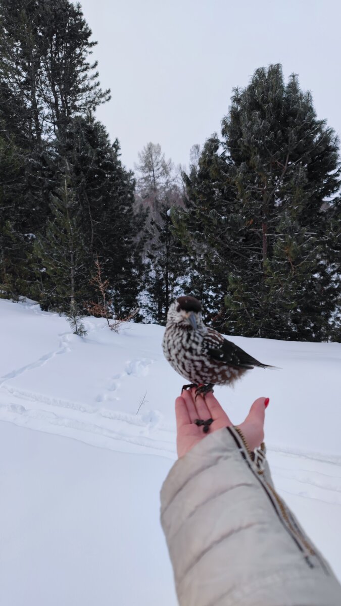 Только приехав в поселок и выйдя из машин - нас сразу шокировали налетевшие на нас птицы. Они совершенно не стесняясь могли присесть на шапку или на вытянутую руку. В поселке Давша живут совсем ручные птицы! И заслуга это местных биологов-метеорологов. Утром, перед отъездом в следующую секретную точку Байкала - нас повезли на экскурсию по заповедному лесу. Выдали меховые лыжи и длинную палку под названием "ангура". Лыжи меховые потому как к обратной стороне приклеена полоска меха норки или нерпы. Это помогает лыжам не скользить, если поднимаешься в гору. Именно на таких лыжах-снегоступах инспектора проводят учёт населения заповедника. Как правило это делается два раза в год. Ангура же помогает стряхивать снег с веток, чтобы он не сыпался за шиворот, или слегка тормозить при спуске с горок. Прогулка по лесу заняла около двух часов, хотя прошли мы всего лишь 2км. Все это время научный сотрудник посвящала нас в тайны леса, учила различать следы разных животных, рассказывала про их пр
