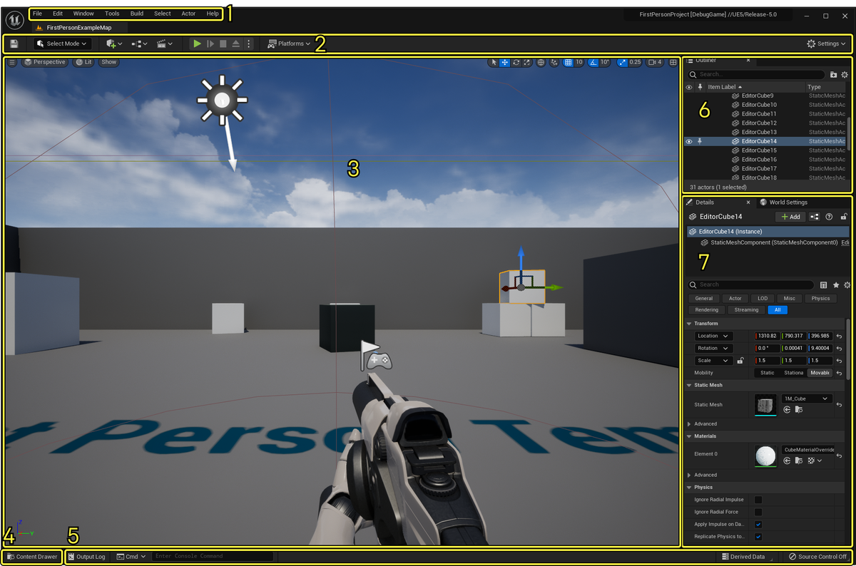 Обзор ключевых элементов интерфейса Unreal Editor.