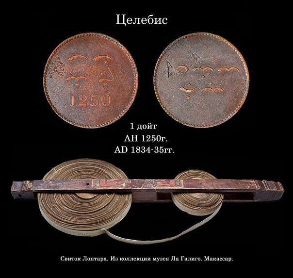 Так что же меня заинтересовало в этом экземпляре? - необычное , ни на какое другое не похожее, письмо, которым написаны легенды на монете, и означающие "земля Буги" - на аверсе (Tanah Ugi), и на реверсе - Seuwa Duwi - один дойт. Предлагаю посетить одинадцатый в мире, по велечине, остров Сулавеси, и познакомиться с уникальной ,по своему, письменностью, и коренным народом бугис.
