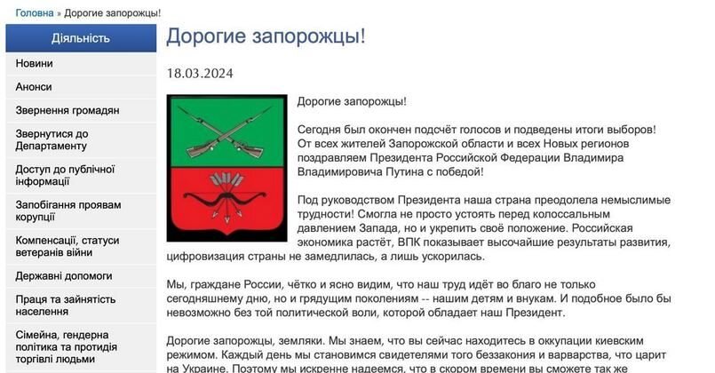 Российские хакеры взломали сайт контролируемого Киевом Запорожского областного совета, выложив на нëм поздравление с победой Владимира Путина на выборах президента России. Об этом в своем телеграм-канале сообщил губернатор Запорожской области Евгений Балицкий. «Наши хакеры взломали ресурсы Запорожского областного совета, временно оккупированного киевским режимом, поздравили земляков с победой Владимира Владимировича Путина на выборах президента России и пожелали будущего вместе с Россией. Мы знаем, что жители Запорожья ждут освобождения от киевского нацизма, надеются на жизнь в справедливом социальном государстве и верят в нашу победу!» — написал Балицкий. Сайт в настоящее время недоступен. Запорожская область вошла в состав Российской Федерации по результатам референдума в октябре 2022 года. На выборах президента России 15–17 марта Владимир Путин одержал победу с результатом 87,28%.
