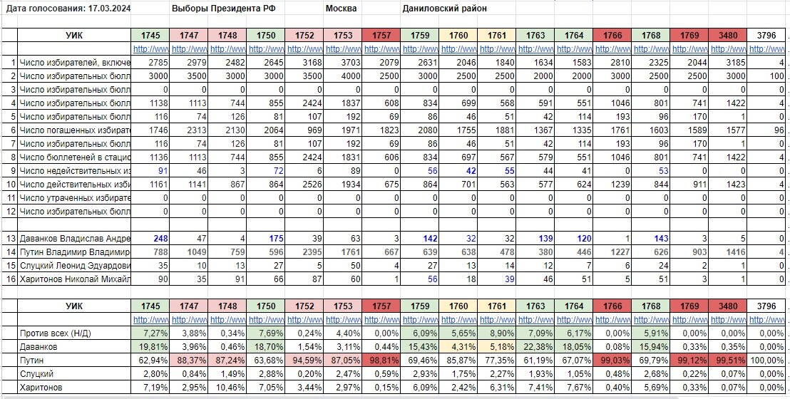После выключения массовых фальсификация в 2012 году наш район голосовал более-менее однородно. Как Москва в среднем или чуть консервативнее. Сейчас же цифры в таблице рисуют нам две параллельных нации (очень четко поделивших территории УИКов между собой!). Космическая "красная" нация, волеизъявление которой выражено на "красных" УИК, переплюнула своими процентами любой Кузбасс или Дагестан. Обгоняет Северную Корею! Проценты национального лидера >99%. Ни одного недействительного бюллетеня. И "зеленая" нация -- та, с которой я ежедневно сталкиваюсь в метро, в магазинах, на улицах района. На этих выборах проголосовавшая 6-9% недействительным, и 15-22% за Даванкова, которого некоторые политики и блогеры нарекли "антивоенным кандидатом".