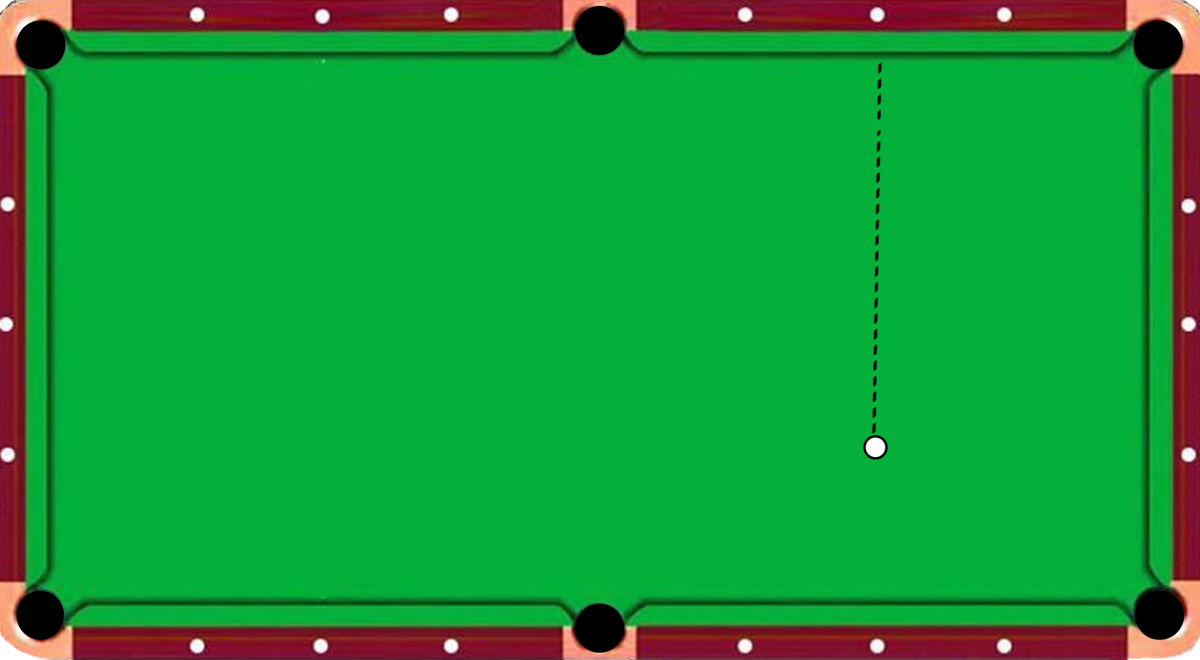 - Поставьте 2 шара согласно изображению, представленному ниже, и разместите биток между ними. Цель: попасть битком по противоположному борту так, чтобы шар вернулся обратно и прошел между поставленными шарами. Выполнить от 5 до 10 раз. **