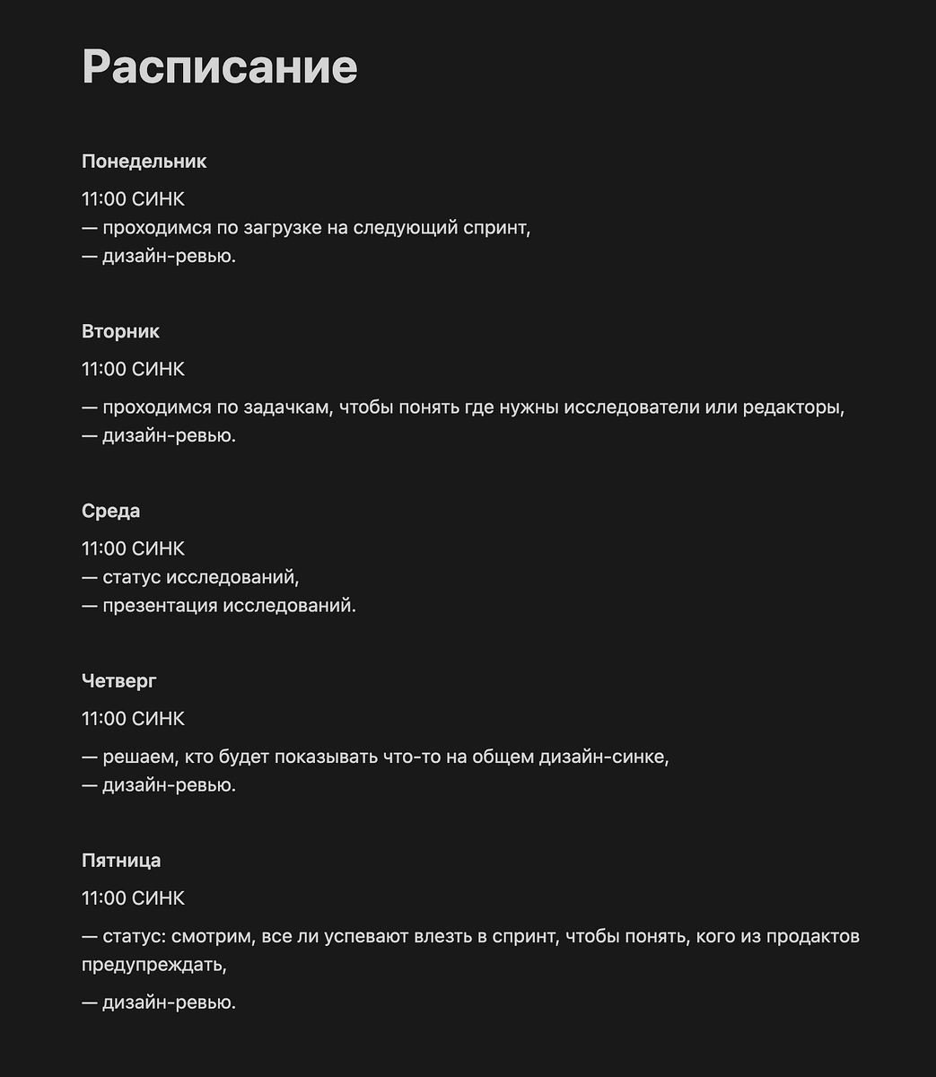 Как синхронизировать команду? Как следить за качеством дизайна? Как растить дизайнеров на постоянной основе? Как часто проводить ревью? На все эти четыре «Как» у меня один ответ и один инструмент вместо четырёх — проводите дизайн-синк каждый день. В этой статье хочу поделиться своим опытом управления командой, задачами и дизайнерами. Каждый день Кажется, что, ну, зачем каждый день созваниваться с командой, зачем тратить на это время. Можно же синхронизироваться пару раз в неделю и этого будет достаточно. Нет, не достаточно — собираться нужно каждый день. И вот почему. Четыре простых правила Следите за временем. Одного часа хватает, чтобы посмотреть на наработки и обменяться обратной связью. Назначьте ответственного. Обычно это сам дизайн-лид, либо ведущий дизайнер. Его задача вовлекать и структурировать. Распределяйте время. Перед началом синка ответственный должен распределить время так, чтобы его хватило на всех. Но бывает, что нужно уделить важной задаче почти весь синк. И не все ди
