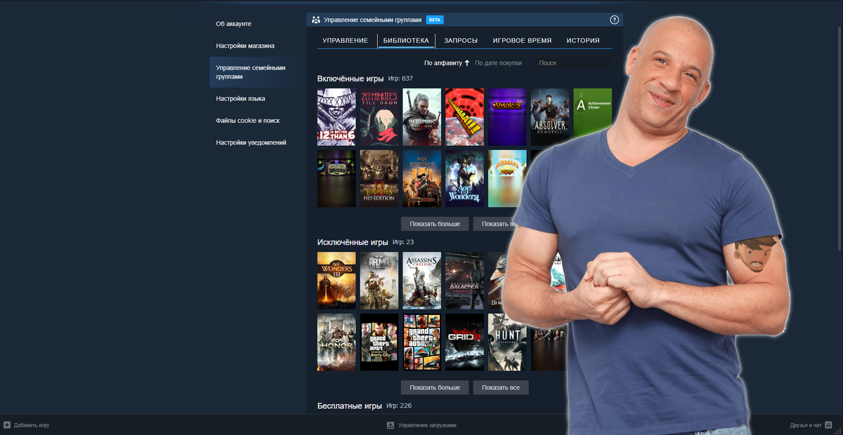 Чтобы подрубить вещь, нужно в настройках интерфейса в разделе бета-тестирований включить Steam Family Beta. Как это выглядит Список членов твоей семьи Список доступных/недоступных игр 1. Кол-во копий 2. Причины, по которым игры недоступны для семьи 3. Кол-во игр в категории И неловкие ситуации Подписывайся на телеграм!