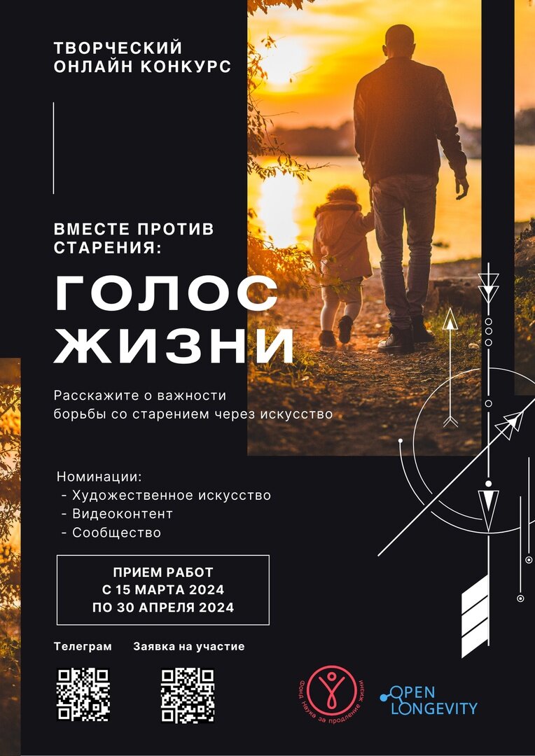 Оргкомитет I Международного творческого конкурса авторов контента в поддержку идеи радикального продления жизни людей «Вместе против старения: голос Жизни» сообщает об официальном старте приёма работ для участия в проекте. Уникальный конкурс проводится фондом «Наука за продление жизни» совместно с международным сообществом Open Longevity (Открытое долголетие) и проектом «Волонтеры Долголетия». Напомним, что ключевая цель конкурса – с помощью творческих форматов, генерируемых представителями креативных и культурных индустрий рассказать о важности задачи борьбы со старением и содействовать формированию общественного запроса на принятие программ по радикальному продлению жизни людей на государственном уровне во всем мире, увеличение финансирования таких программ и привлечение к решению проблемы старения крупного бизнеса. Конкурс проходит по трём номинациям: 1. Художественное искусство – графика, дизайн, фотография или рисунок, отображающие ценность борьбы со старением и достижения радикал