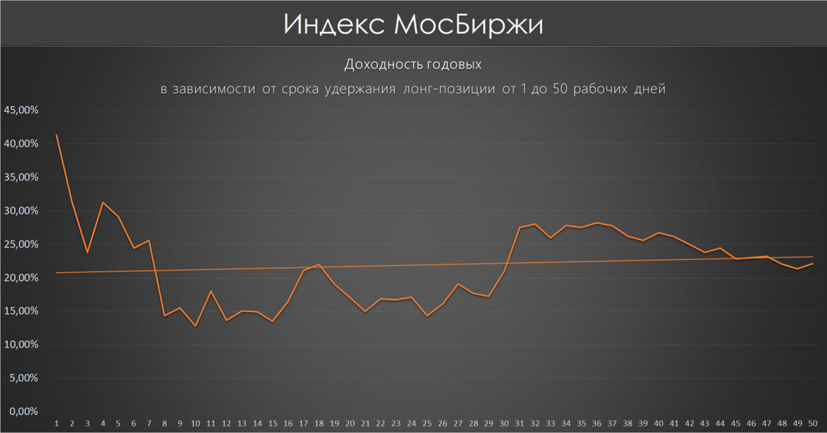 По статистике, при текущих показателях и Trend Ratio 86%, лучшую вероятность положительного результата показывали сделки на покупку, которые удерживались 35 рабочих дней. Они имели следующие характеристики: