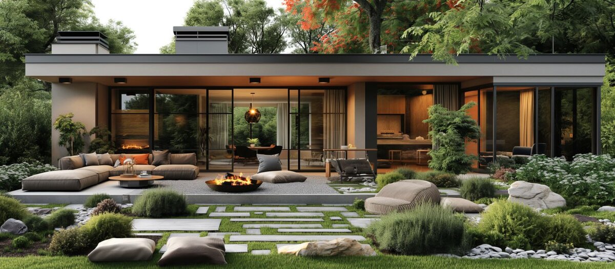 🏛 На проекте представлен современный дом с панорамными окнами и террасой. Дом имеет плоскую крышу, и его фасад выполнен в нейтральных оттенках. Впереди расположена обустроенная зона отдыха на открытом воздухе: имеется группа удобной мебели, состоящая из большого углового дивана с подушками и столика перед ним. На террасе также находится круглый огненный котёл для обогрева и создания уютной атмосферы. 🍃 Выложенные плиткой дорожки окружены зелёным газоном, посажены низкорослые кустарники и декоративные травы. Видны крупные валуны и аккуратные грядки с растениями. Вся эта зелень создаёт впечатление элегантности и спокойствия. За пределами участка виднеется лесная растительность с высокими деревьями и кустарниками, что подчёркивает гармонию природы и архитектуры. В целом, композиция создаёт впечатление изысканного дизайна ландшафта и архитектуры, призванного для расслабления и наслаждения живописным видом. 📐 Вы так же можете ознакомиться с актуальной планировкой дома, которую предла