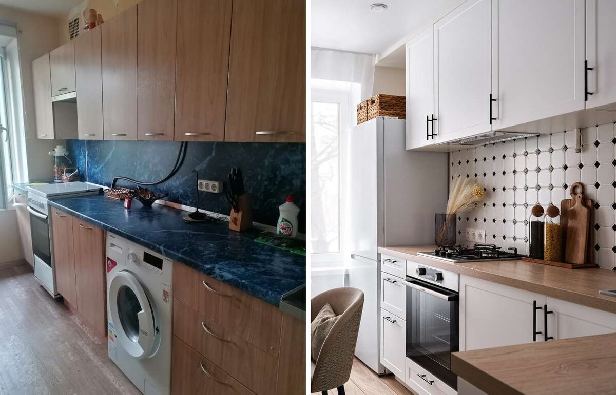 Из «уставшего» жилья сделали стильное и функциональное пространство В квартире будет жить молодая пара: он работает в сфере IT, она — директор ювелирного магазина. Перед дизайнером Анной Кузнецовой стояла задача обновить отделку и оформить максимально удобный и функциональный интерьер без перепланировки. По функционалу удалось разместить спальню-гостиную с удобным рабочим местом, гардеробную, санузел, кухню. Кухня до ремонта Это была типовая кухня с вышедшей из моды отделкой и безликой мебелью. Требовалось улучшить функционал и придумать стильный дизайн. Кухня после ремонта Кухню не переносили, газовую трубу спрятали за кухонным гарнитуром, а газовый шланг остался на фасадной части фартука. Кухня максимально наполнена бытовой техникой: стирально-сушильная машина, посудомойка, духовка, вытяжка. Остальные зоны хранения находятся в верхних и боковых шкафах гарнитура. В нижней части под раковиной предусмотрено место для фильтра и измельчителя. Обеденный стол раскладывается, что позволяет п