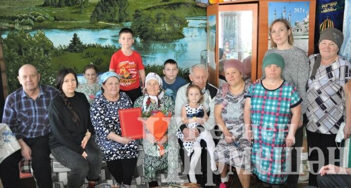 В доме Галии Фахрутдиновой из Беркет Ключа в день 90-летия было очень оживленно, на торжество собралось немало гостей – дети, внуки, правнуки и родные. К сожалению, Галия эби плохо слышит, нам не удалось поговорить с ней, однако дочери, пришедшие на праздник, с удовольствием рассказывали о ней. - Наша мама – большая молодец, она мастер на все руки, всю жизнь работала, всегда была в числе передовиков. Они с папой трудились на тяжелых работах, долгие годы валили лес. Если некоторые обрабатывали по одному-два гектара свеклы, то мы брали по три гектара, - поделилась старшая дочь Равиля Мингалимова, приехавшая на юбилей матери из Набережных Челнов. - Как-то сидела и просматривала трудовую книжку мамы, там написано, что она является членом колхоза с 11 лет, - отметила дочь Резеда Бурганова, проживающая в Верхней Кармалке. - Наш папа был мягким человеком, а мама, наоборот – боевая и очень работящая. И сами работали, не покладая рук и нас приучили к труду. Папа был плотником, очень многим пом