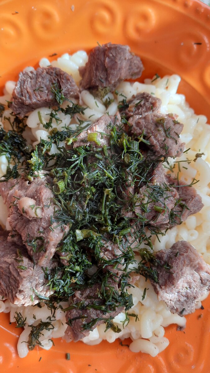 Готовим говяжий гулять с томатной пастой, чесноком специями и рожки с маслецем сливочным и зелёным укропчиком