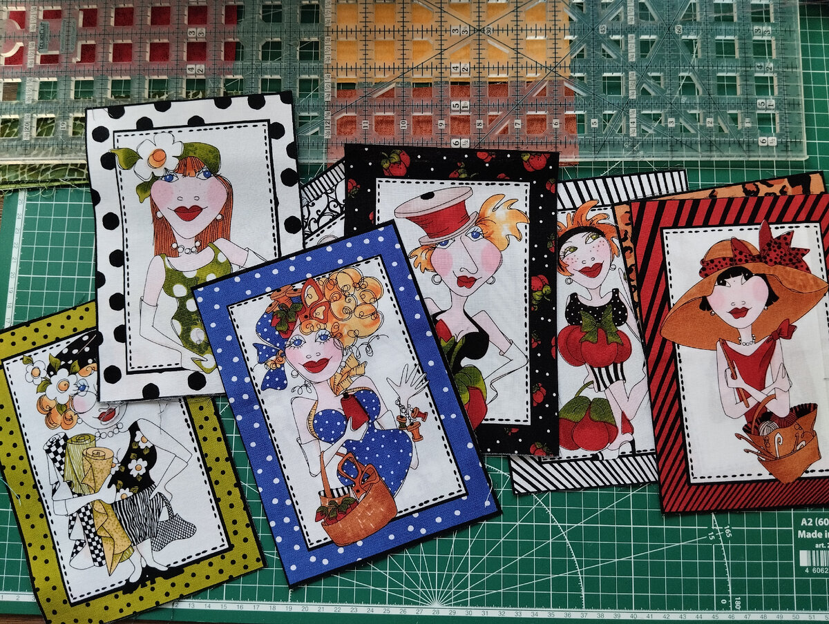 Как-то не задалось у меня этой зимой с шитьём. Зато связала два пуловера: себе и дочери. Но, наконец, решила, что пора уже что-нибудь и пошить. И это "что-нибудь" оказалось ланчматами. Я уже давно купила ткань с целью сшить из неё именно ланчматы. Вы, наверное, встречали этих "тёток": Надо сказать, что одно время я никак не могла их найти. И, наверное, поэтому когда нашла, купила сразу три варианта этих дам. И было это года четыре назад... С тех пор эти отрезы и лежат у меня мёртвым грузом. Но я не просто так искала эту ткань. Пять лет назад я уже шила ланчматы с этими тётеньками. И мне они очень нравились: Были ещё другие ланчматы, в красных тонах, но за давностью уже даже фотографий не нашла. И вот достала я эти свои отрезы, выбрала из них один, с картинками одинакового размера и решила потратить часть своих запасов на шитьё ланчматов. Вопрос "куда я их потом дену?" остаётся пока открытым, потому что картинок оказалось аж 21 штука! Итак, решила я не отступать от прежнего дизайна и сш