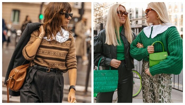 Хлопковые белоснежные накладные воротнички отлично смотрятся в одном тандеме с вязаными уютными вещами. Для «ВАУ» эффекта лучше выбирать вещи контрастных оттенков, тогда трендовый аксессуар будет выигрышно выделяться на их фоне. Данное сочетание можно носить, как с базовыми джинсами, так и классическими брюками из натуральной ткани или же цветной кожи.