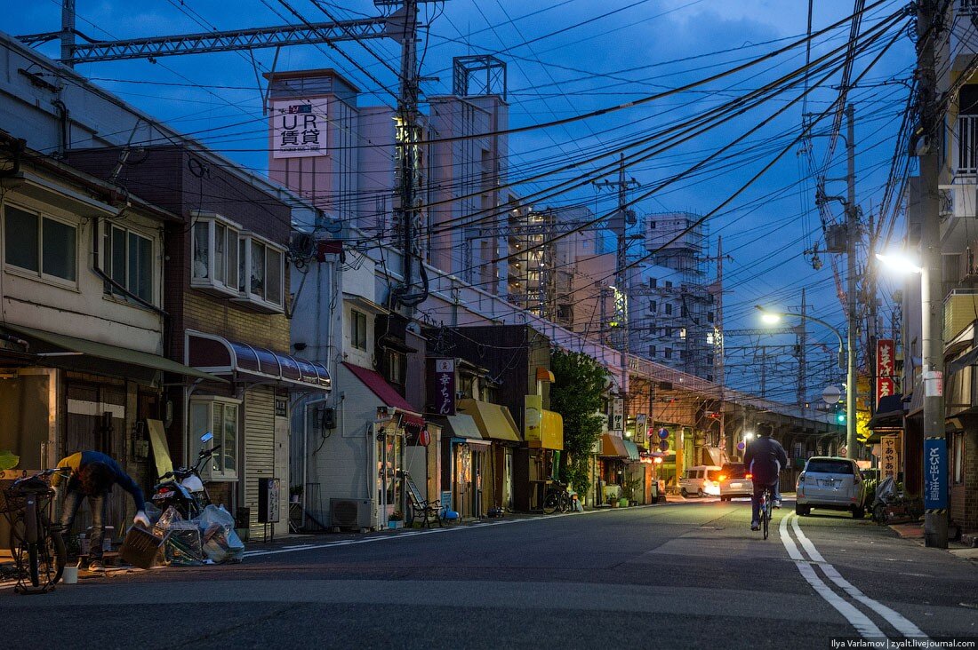 36. Под железнодорожными эстакадами всегда располагаются самые красвые и живописные домики. В этих трущобах живут бедные японцы, находятся недорогие бары и магазины.