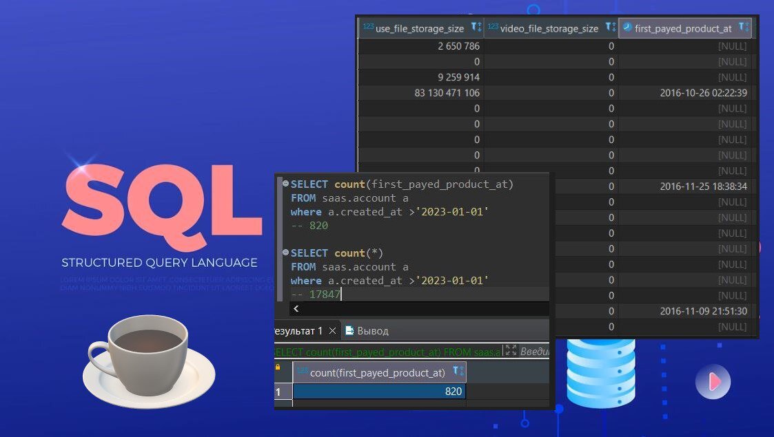 Как пример, привела скрины dbeawer из базы. Есть колонка first_payed_product_at с пропусками. В варианте count(*) считается все, а в варианте count(first_payed_product_at) только заполненные строки (820 значений).