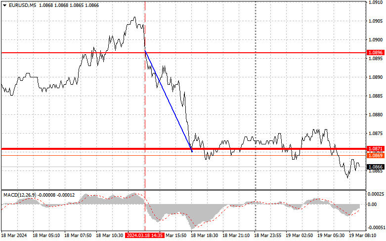 №2: покупка при двух подряд тестах цены 1.0860 в момент, когда индикатор MACD находится в области перепроданности. Цели – 1.0879 и 1.0914.