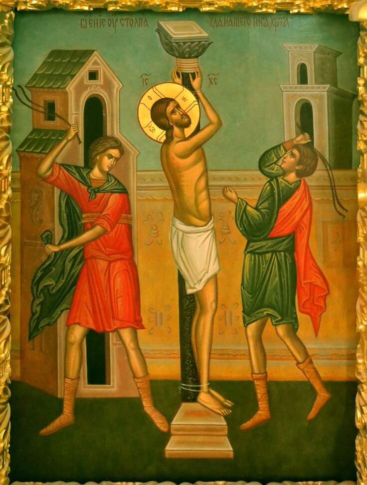 История В иконописи сцена бичевания Спасителя имеет название «Бичевание у столпа Господа нашего Иисуса Христа». Изображение могут сопровождать пророческие слова: «Плещи моя вдах на раны и ланите мои на заушение» .