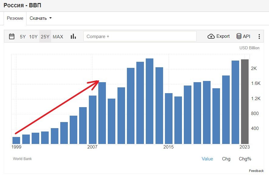 Для тех, кто подзабыл, напомню, как тогда рос ВВП. Вот его динамика в долларовом (!) эквиваленте: с 2000 по 2008 годы он вырос примерно в 8 раз в долларах!