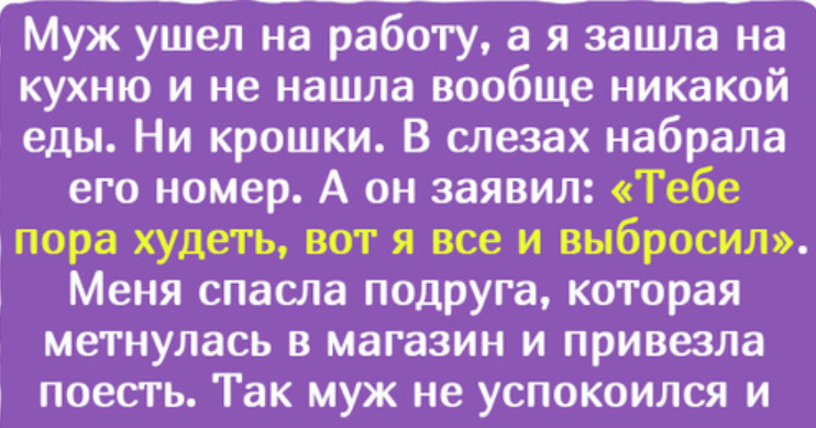 Недавно муж ушел на работу, а я зашла на кухню, чтобы перекусить, и не нашла вообще никакой еды. Ни крошки. Я в слезах набрала его номер, чтобы узнать, куда пропали продукты, так необходимые мне для того, чтобы нормально кормить грудью, а он заявил, что мне нужно похудеть, поэтому он все выбросил. Меня спасла лучшая подруга, которая, после моего звонка, метнулась в магазин и привезла продукты.