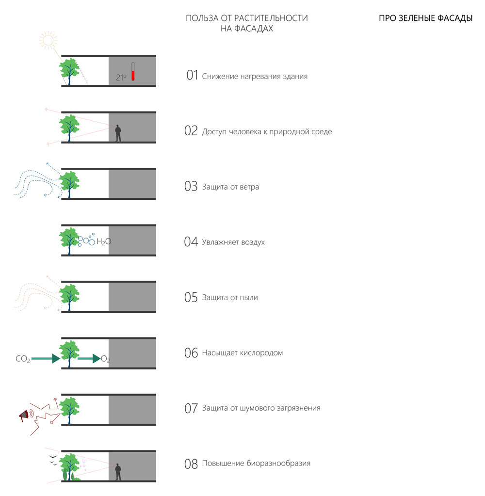 В Москве на одном из зданий сооружают карбоновый полигон по «зелёному» ГОСТу, разработанному в НИУ МГСУ для вертикального озеленения фасадов зданий и сооружений. Проект реализуется в рамках федеральной программы «Приоритет-2030». Карбоновый полигон — это специальный участок местности или отдельное здание, где проводят эксперименты по контролю за выделением и поглощением парниковых газов. Более половины выбросов парниковых газов с урбанизированных территорий планеты приходится всего на 15 городов, одним из которых является Москва. Ежегодно она выбрасывает в атмосферу более 110 миллионов тонн CO2-эквивалента, и опережают её лишь шесть китайских городов. Проведённые учёными исследования показали прямую зависимость между концентрацией углекислого газа в атмосфере и здоровьем людей. Один из путей решения этой проблемы — масштабное озеленение городских территорий. Использование вертикального озеленения, которое является одним из приёмов благоустройства городской среды в части устойчивого, эк