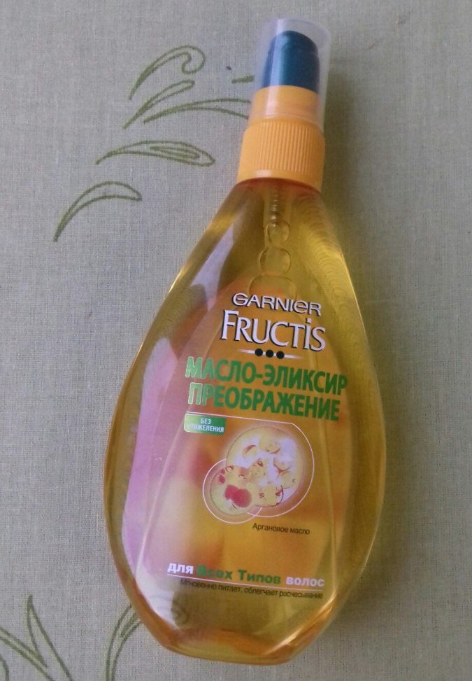 В поиске "своих" средств купила этот "эликсир". Напомню о том, что я пытаюсь привести свои вечно крашеные волосы в более или менее порядок и отрастить длину. Масло-эликсир для волос Fructis Преображение У меня тонкий волос, склонный к быстрому жирнению (жирению, ожирению... не знаю как правильно)))))))). Коротко о товаре · Производитель: Garnier · Средство: масло · Тип волос: для всех типов · Область применения: комплексного действия, уход за волосами · Облегчает расчесывание: да Масло можно применять до мытья, после перед укладкой и в любое время, когда это необходимо. Я пользовалась два раза, мне хватило понять, что это средство - не мое. Объем - 150 мл. Сразу скажу, что в составе средства есть силикон. Силикон в больших количествах вреден для волос. Первое применение было до мытья. Я нанесла его на несколько минут и потом промыла своим шампунем. Вымывается не так просто (возможно надо другой шампунь). Смогла смыть только со второго раза. С первого даже шампунь не хотел пениться. С
